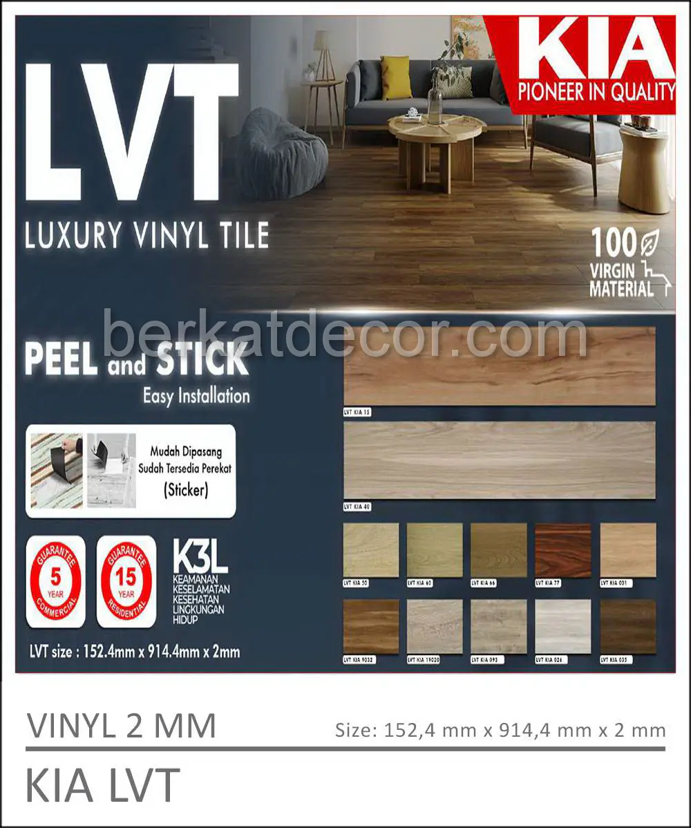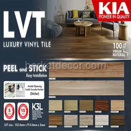 Perlu Anda ketahui bahwa produk KIA LVT kuat hingga lebih dari 10 tahun, Tetapi untuk perawatannya relatif sangat mudah. Asalkan sisa barang Anda simpan, dengan sisa barang itu kerusakan akan dapat diperbaiki dengan mudah. Jangan ragu ragu lagi, segera percantik ruangan Anda karena kami punya beragam model produk untuk Anda pasang di Rumah atau Kantor Anda.